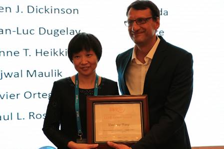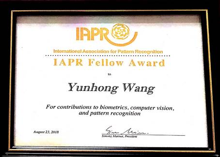 第24届国际模式识别大会于2018年8月21日至24日在北京召开,会上,王蕴红教授因其在生物特征识别、计算机视觉、模式识别方面的学术贡献当选为国际模式识别学会会士 (The International Association for Pattern Recognition, IAPR Fellow)。国际模式识别学会(IAPR)主席Simone Marinai向王蕴红教授颁发了IAPR Fellow证书。