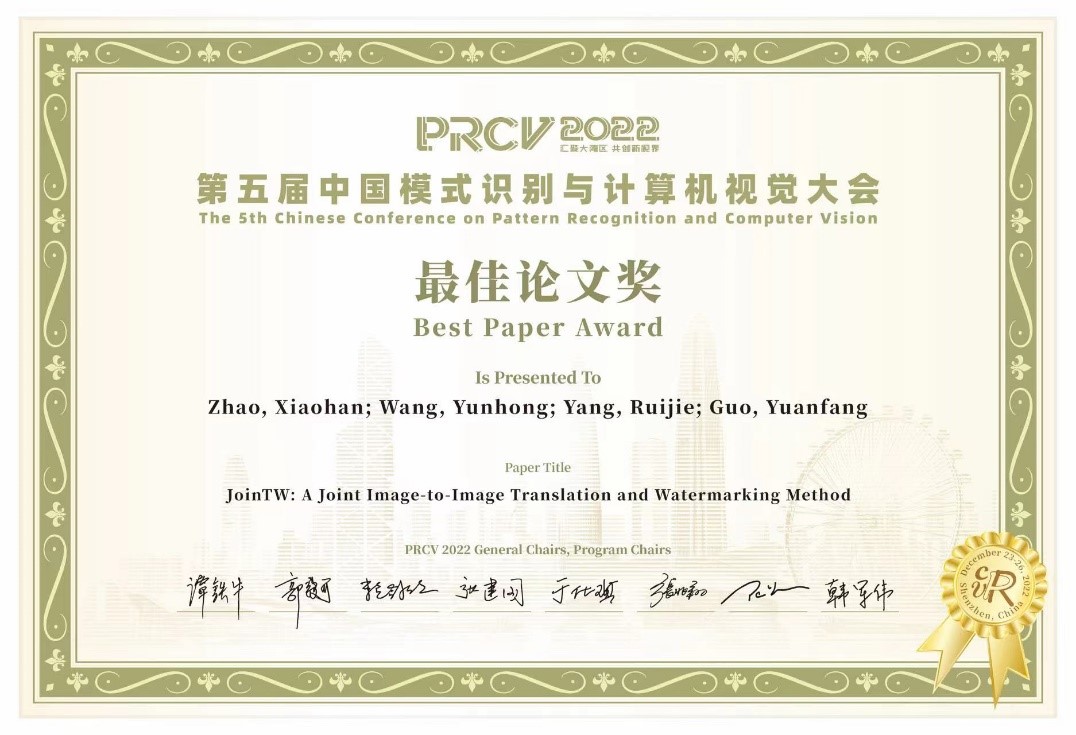 本次会议IRIP实验室赵晓涵同学的论文“JoinTW: A Joint Image-to-Image Translation and Watermarking Method”被录用口头报告,并获评最佳论文奖(Best Paper Award)。此外,借助会议专题论坛与讲习班的机会,与产学研各界科研人员进行深入交流与讨论,相关研究成果获得广泛关注。