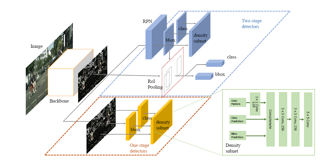 为了解决行人检测任务中目标过于密集的问题,本文提出了一种自适应的非极大值抑制(Adaptive NMS)的行人检测后处理方法,通过网络预测目标周边的密集和稀疏的程度,采用不同的去重策略。该方法对于双阶段和单阶段的检测器都有效果,在密集行人数据库CityPersons和CrowdHuman上都能提升现有的检测器的效果。本文已被CVPR2019接受为Oral。