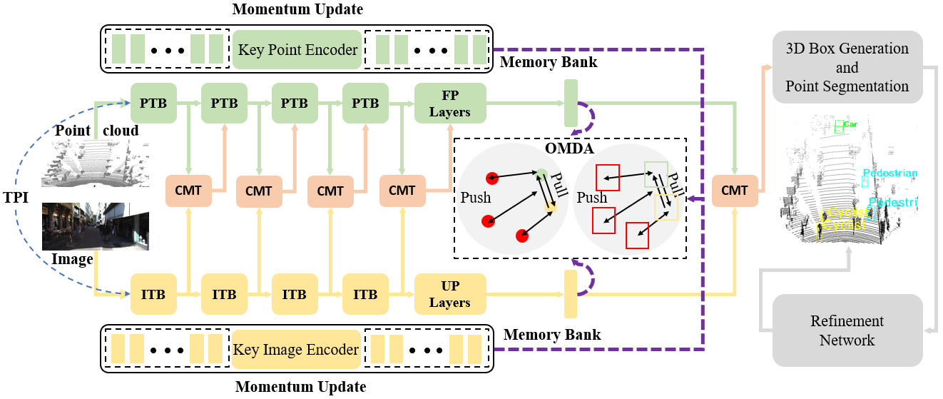 本文提出了一种用于多模态3D目标检测的对比增强Transformer:CAT-Det,旨在解决多模态融合不足和缺乏有效的多模态数据增强的问题。CAT-Det由Pointformer分支、Imageformer分支和Cross-Modal Transformer模块联合编码模态内和模态间远程上下文,从而充分挖掘用于检测的多模态信息。此外,我们通过在点和物体级别上的分层对比学习提出了一种有效的单向多模态数据增强方法。在KITTI数据集上进行了实验,验证了其优越性。