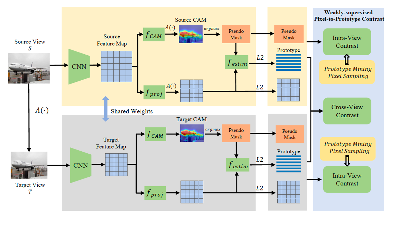 To solve the problem of granularity mismatch between image-level supervision and pixel-level supervision in weakly supervised semantic segmentation, a weakly supervised pixel-to-prototype contrastive learning method is proposed, which provides cross-view consistency and intra-class compactness and inter-class dispersion constraints for segmentation task through cross-view and intra-view contrast. Experiments have proved the effectiveness of the method.
