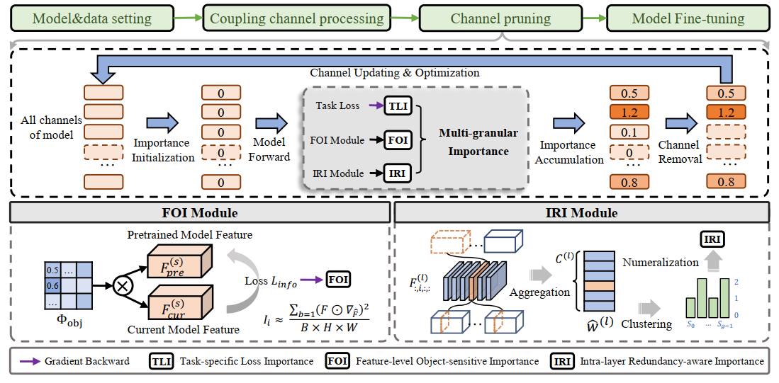 最近计算高效的目标检测器受到越来越多的关注,特别是当部署在资源受限的设备上时。本文研究使用通道剪枝将预训练的深度目标检测器压缩为轻量级目标检测器,这在提高效率方面是有效且灵活的。然而,大多数现有方法基于通用目的的单调标准(即特定任务损失的重要性)来修剪通道。它们容易过度修剪中间层,同时留下大量的层内冗余,严重影响检测精度。为了解决上述问题,我们提出了一种基于多粒度重要性估计(MIEP)的新型通道修剪方法,包括特征级目标敏感重要性(FOI)和层内冗余感知重要性(IRI)。前者利用预训练模型中的对象特征作为指导,为表示目标至关重要的通道赋予较大的权重,并与基于任务的损失相结合时减轻过度剪枝。后者基于聚类对高度相关的通道进行分组,随后优先修剪这些通道以减少冗余。对 COCO 和 VOC 基准的大量实验表明,MIEP 明显优于最先进的通道修剪方法,与轻量级目标检测器相比,在准确性和效率之间实现了更好的平衡,并且可以很好地推广到各种检测框架(例如Faster-RCNN 和 FSAF)和任务(例如分类)。
