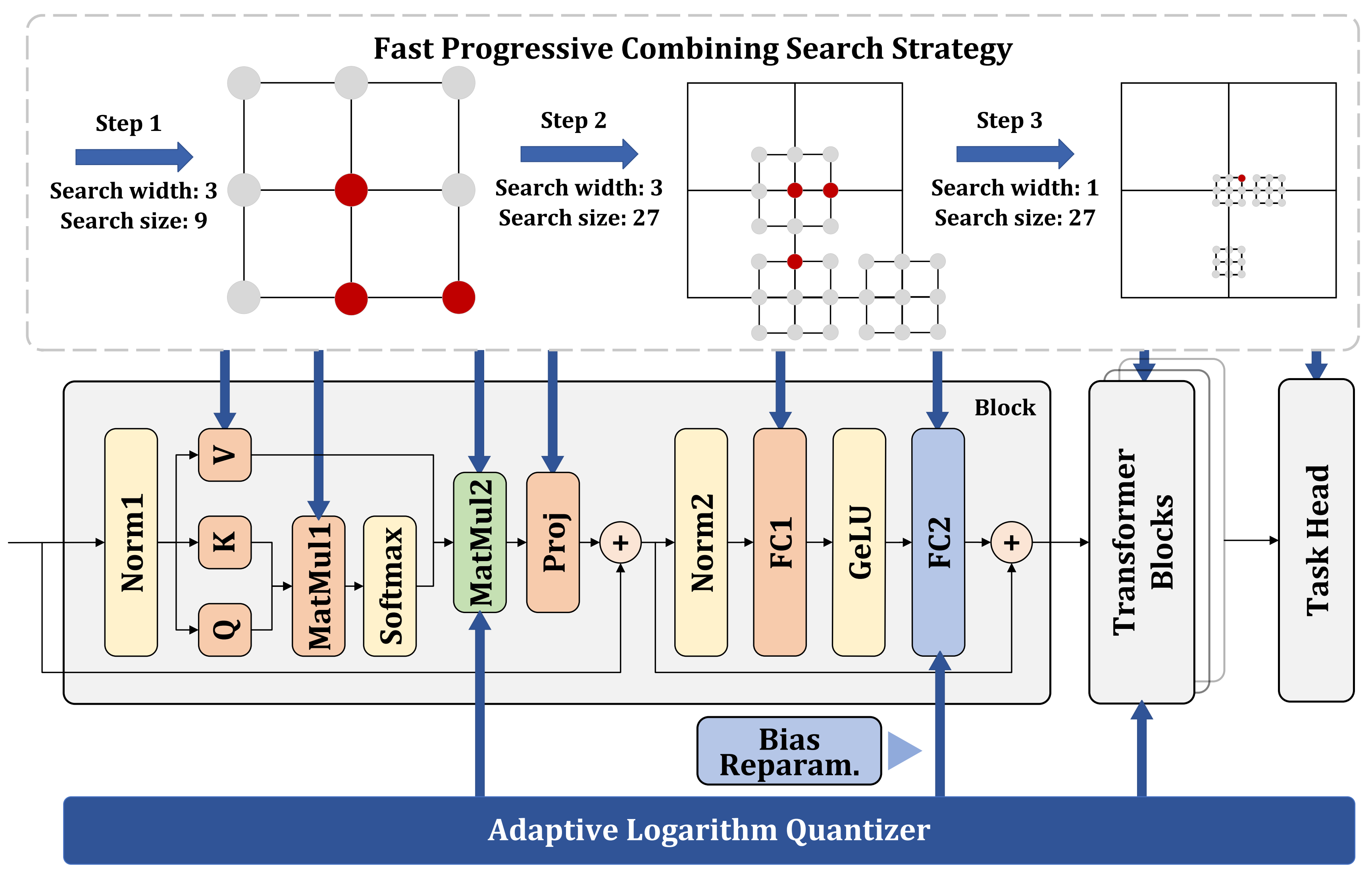 在视觉Transformer的训练后量化中,对于注意力图等服从幂律分布的激活量化一直是一个重要课题。现有的幂律分布量化方法基本是使用基于对数的非均匀量化器。然而,现有的对数量化器难以根据数据分布与量化位宽动态调整,导致在低比特量化中精度损失严重。针对以上问题,我们引入了一种硬件友好的底数自适应对数量化器AdaLog,能够根据数据分布自适应地选择合适的对数底数,并通过查表操作实现硬件友好的推理。通过引入偏置重参数化技术,我们成功地将AdaLog量化器用于post-GELU激活量化。此外,我们提出了一种快速联合超参数搜索算法用于准确获取量化超参数。我们在分类、检测、分割等任务上广泛验证了我们方法的有效性。
