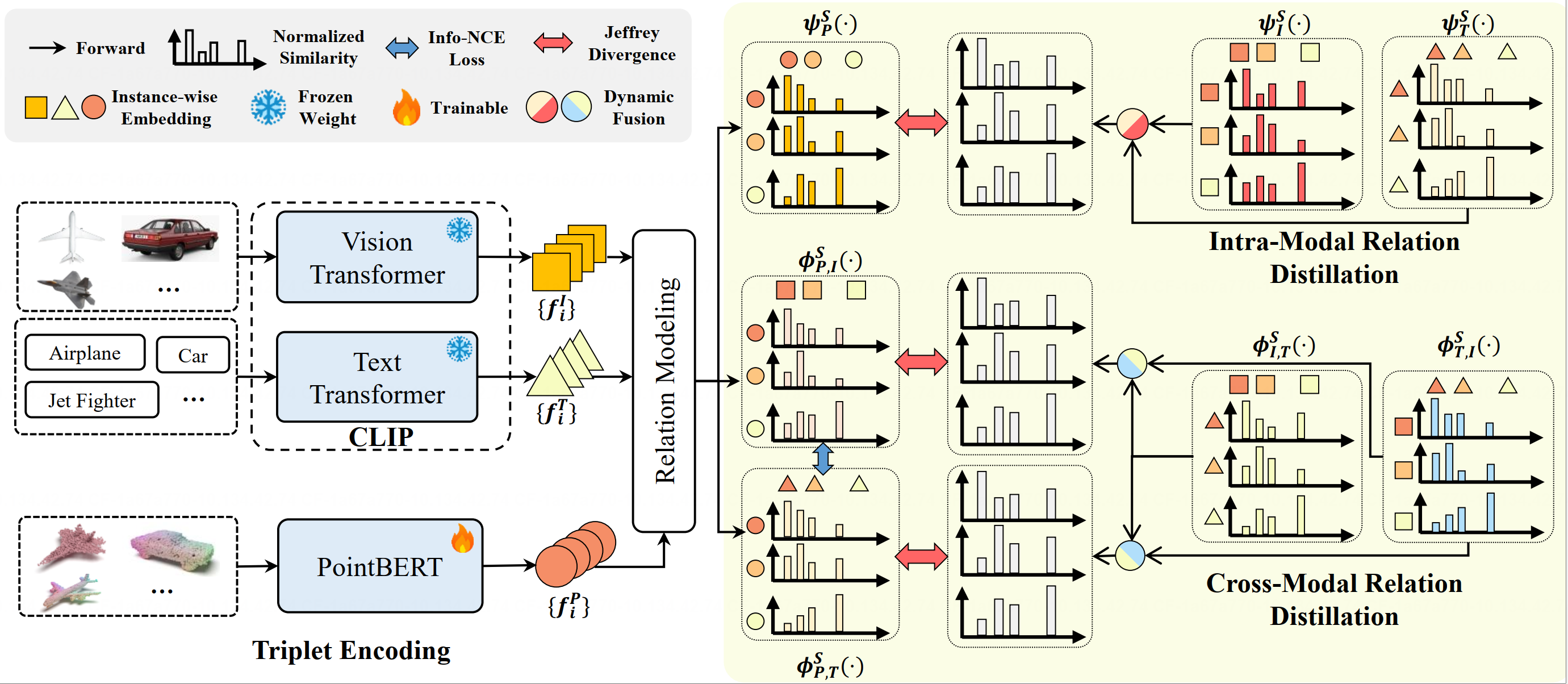 三维点云多模态预训练通过对齐样本在点云模态、图像模态和文本模态下的表征来完成三维数据的跨模态表征构建。现有方法主要关注于样本级别的多模态表征对齐,而忽略了预训练图文空间内不同样本之间的复杂表征结构关系。为了解决这个问题,我们提出了一种多模态关系蒸馏框架,通过探究模态间和模态内的关系表示方式和动态关系蒸馏方法,得到了更具判别性的三维点云表示。所提出的方法在下游三维零样本分类任务和跨模态检索任务方面取得了显著的性能提升,在相同参数量条件下达到了当前最优性能。